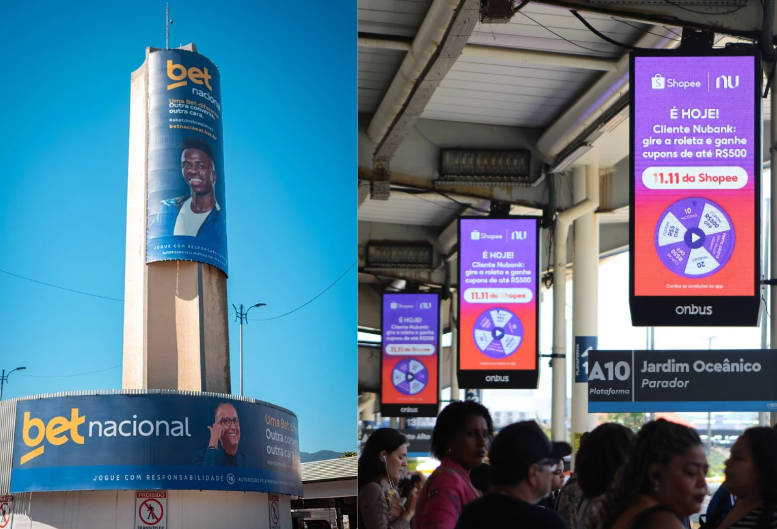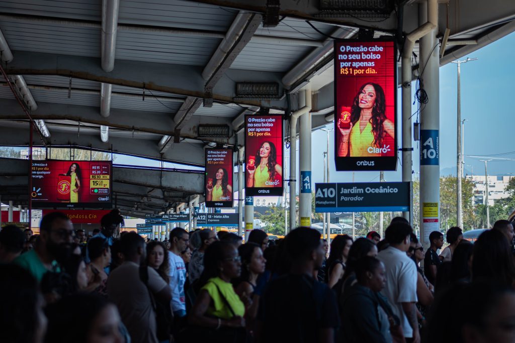 Entre os principais ambientes estão terminais de ônibus e estações, onde há alta concentração de pessoas e tempo de espera. Também aparece dentro dos ônibus, no chamado DOOH embarcado, com exposição prolongada ao longo do trajeto.